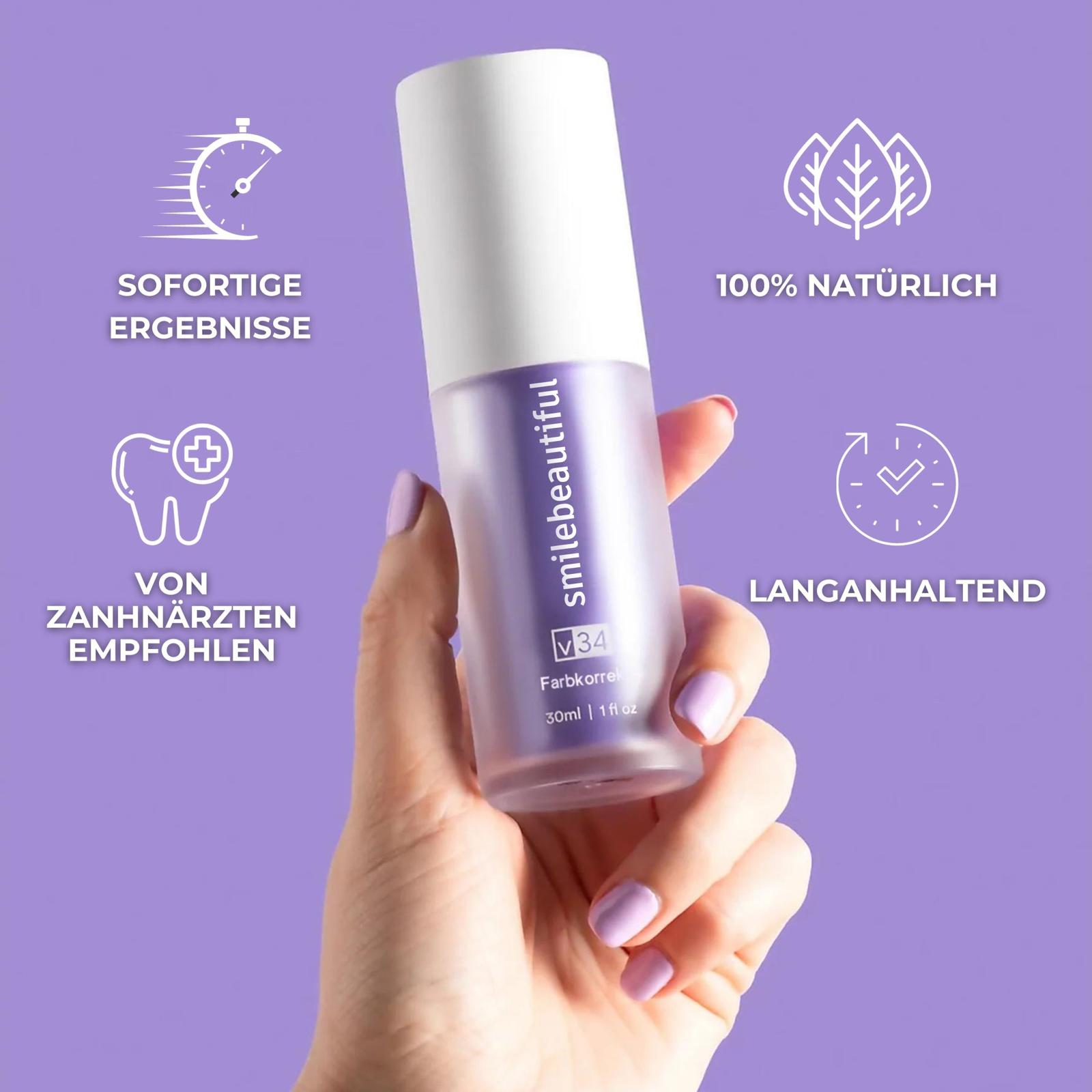 Wenn du Violett auf deine ZĂ€hne auftrĂ€gst, werden die gelben Untertöne neutralisiert und aufgehoben, sodass ein deutlich hellerer WeiĂton zum Vorschein kommt. Ziemlich cool, oder?